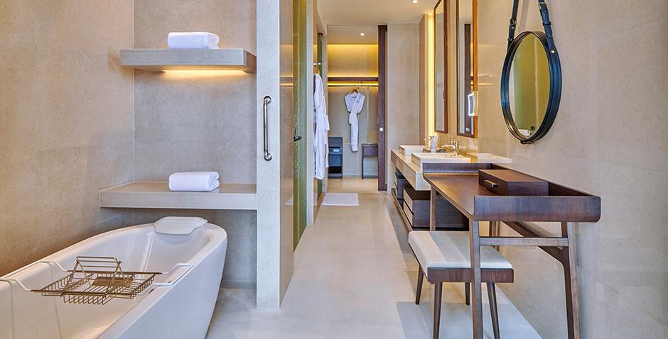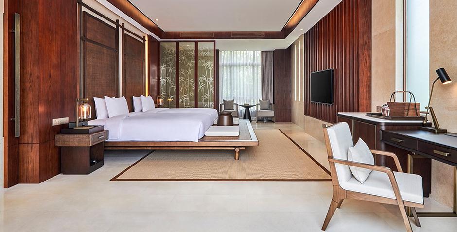 110间客房,面积从72平到200平不等,从豪华湖景房到豪华湖景双卧泳池套房均可以选择,其中包含70间独栋别墅套房。